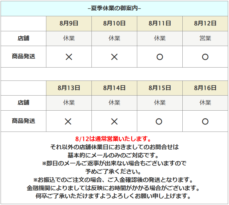 お盆期間中の商品発送・お問合せのご対応に関しまして